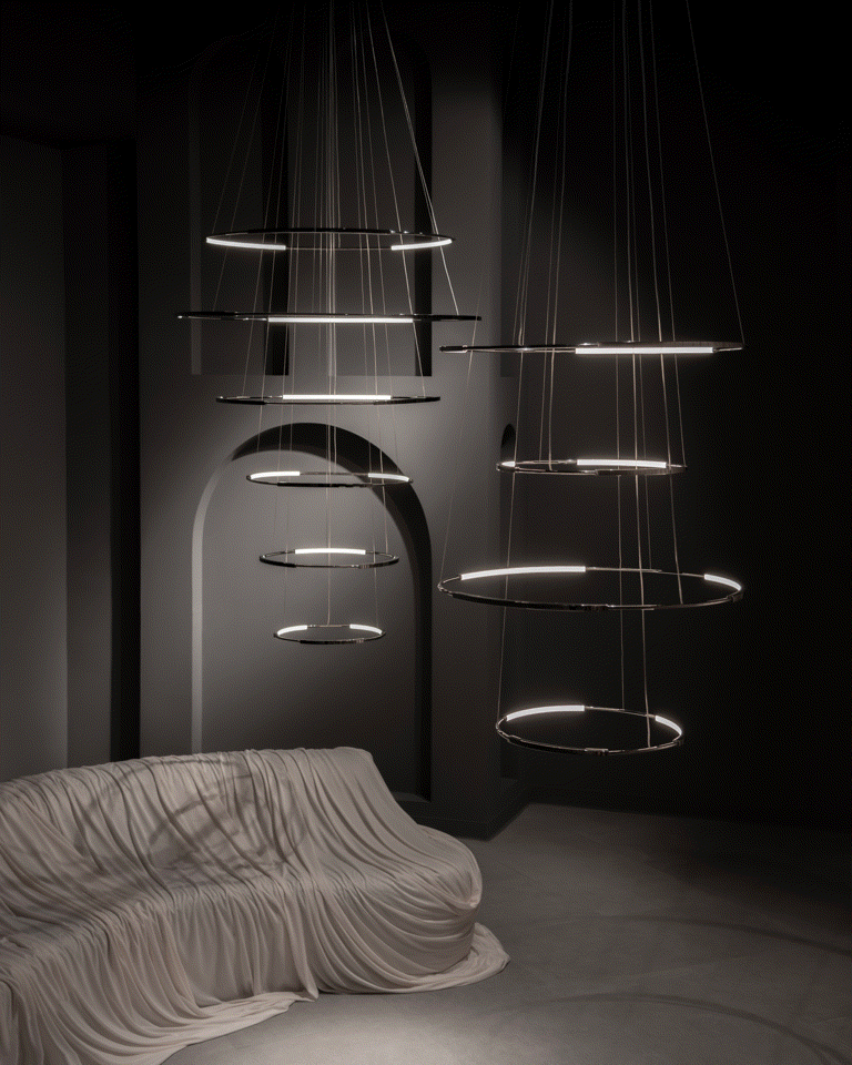 El movimiento hipnótico de sus patrones de luz agrega un toque dinámico y sofisticado a los espacios.