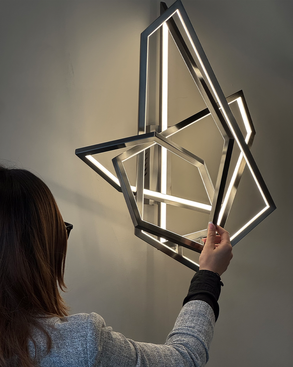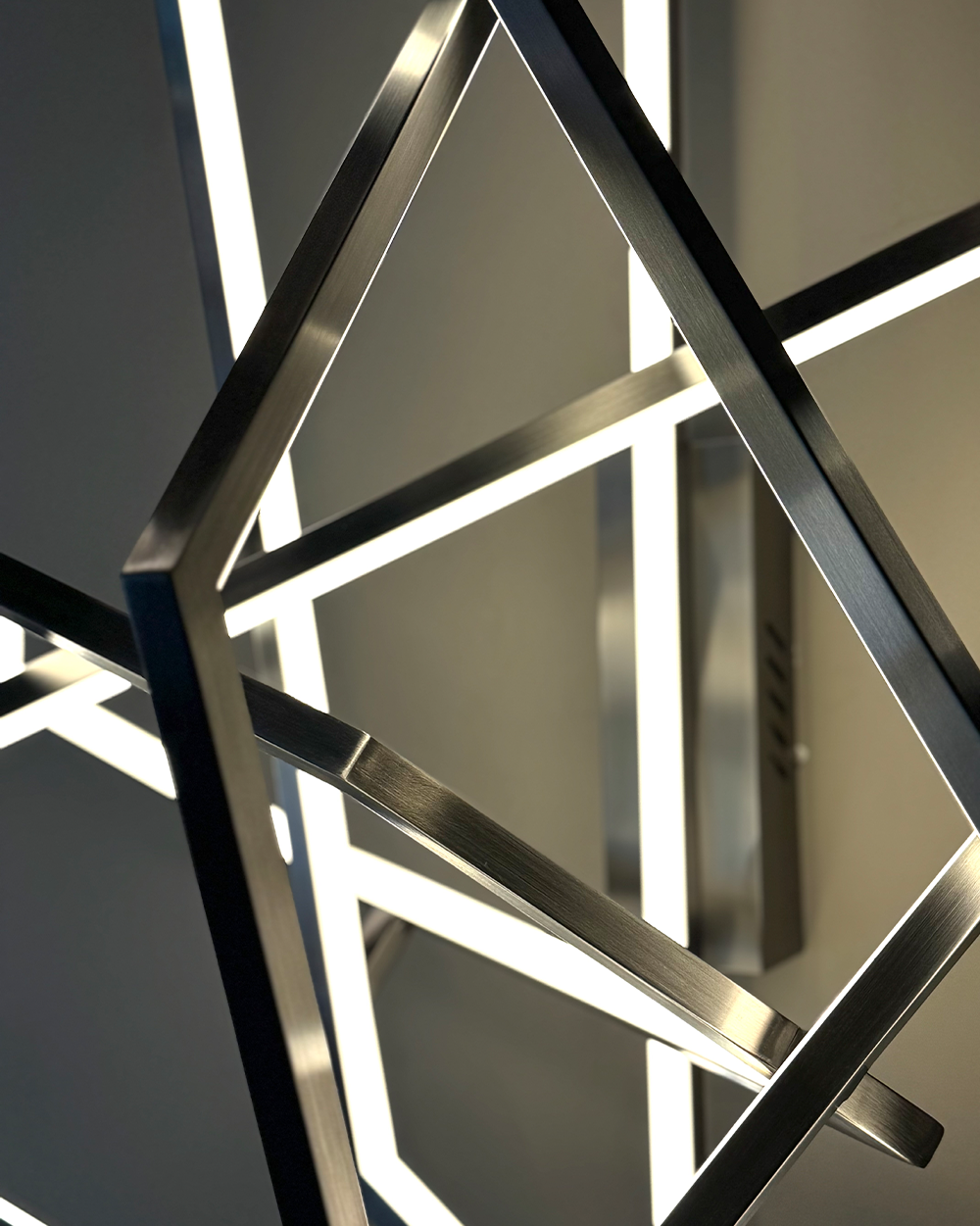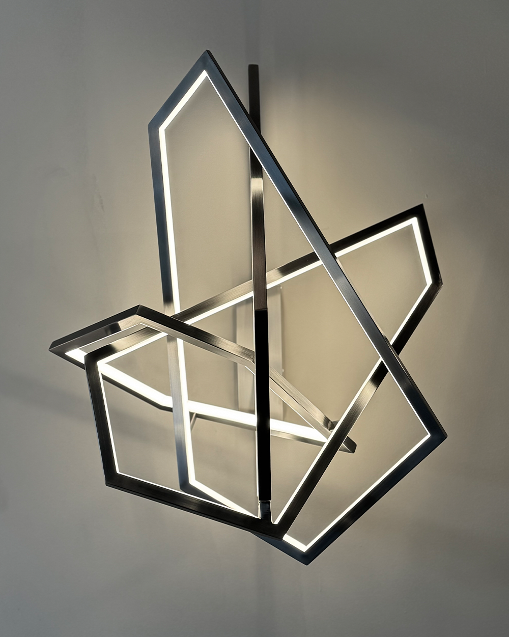 Apolo es compleja y rupturista. Cuatro polígonos enlazados dan forma a un diseño arriesgado y protagonista. Fabricada artesanalmente en acero inoxidable, combina metal con un filo interno de luz. Su estructura es ideal para un espacio destacado.