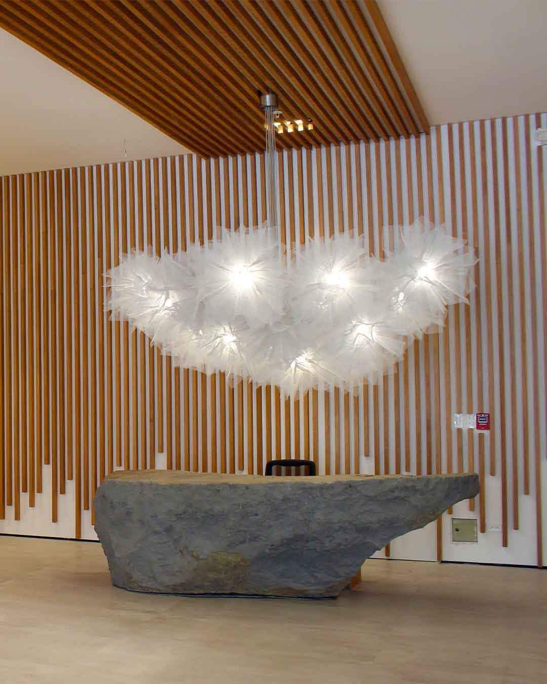 Fluo Composición, por Arturo Álvarez (Good Design Award 2009). Malla de acero galvanizado que simula un tejido vaporoso. Gran ligereza visual y expresividad.