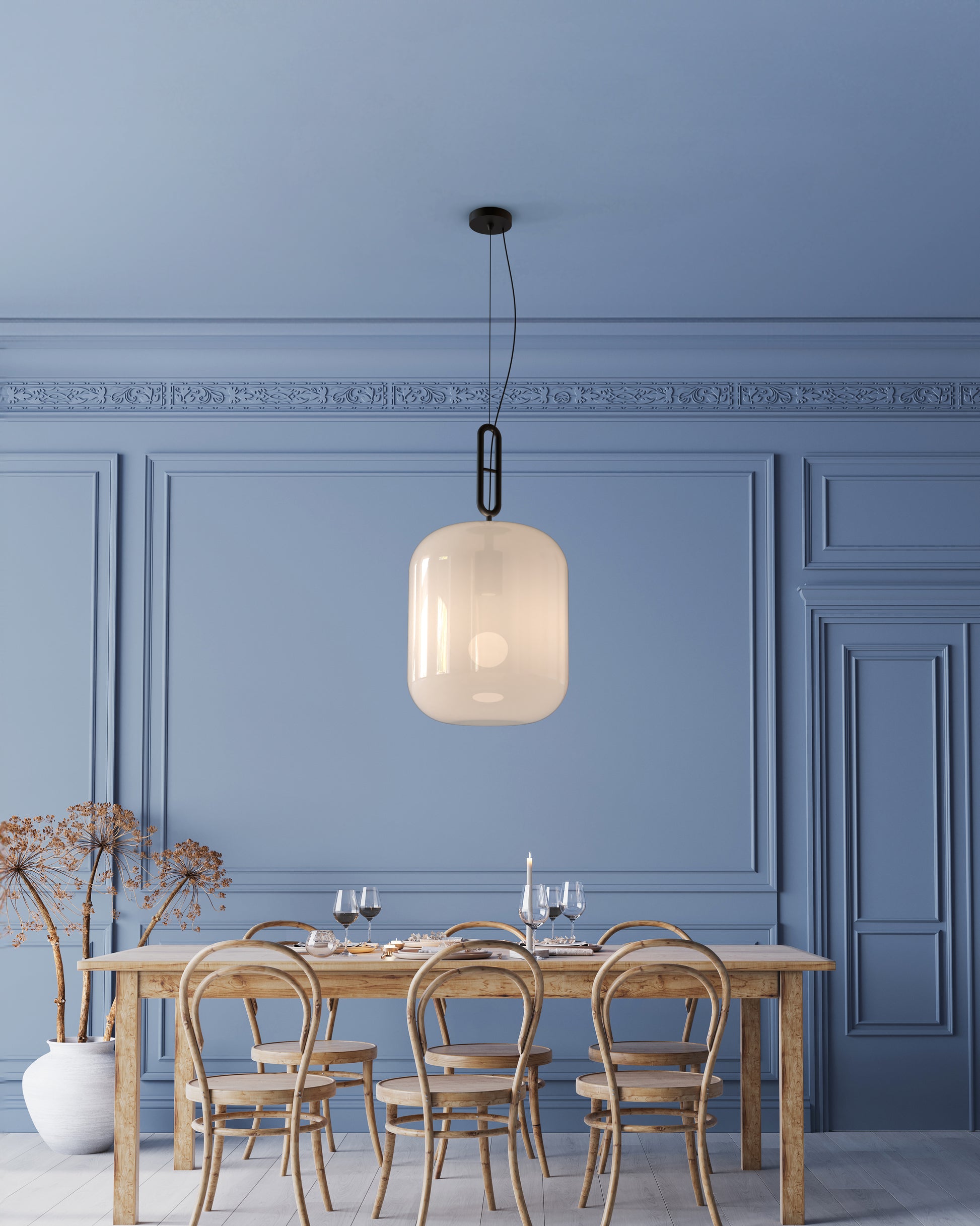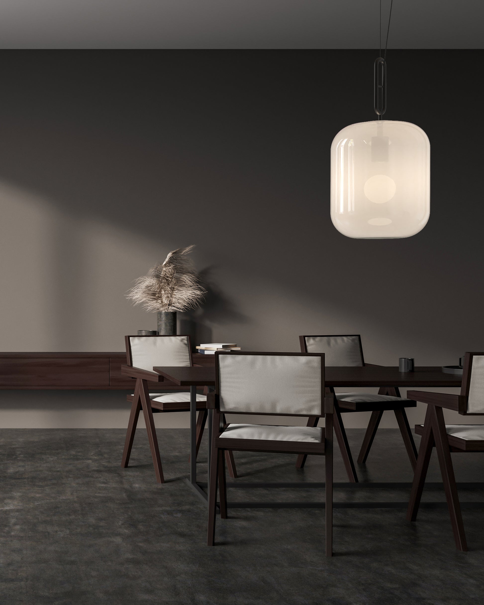Grafin L es una luminaria fabricada en vidrio y con terminaciones en aluminio negro.
