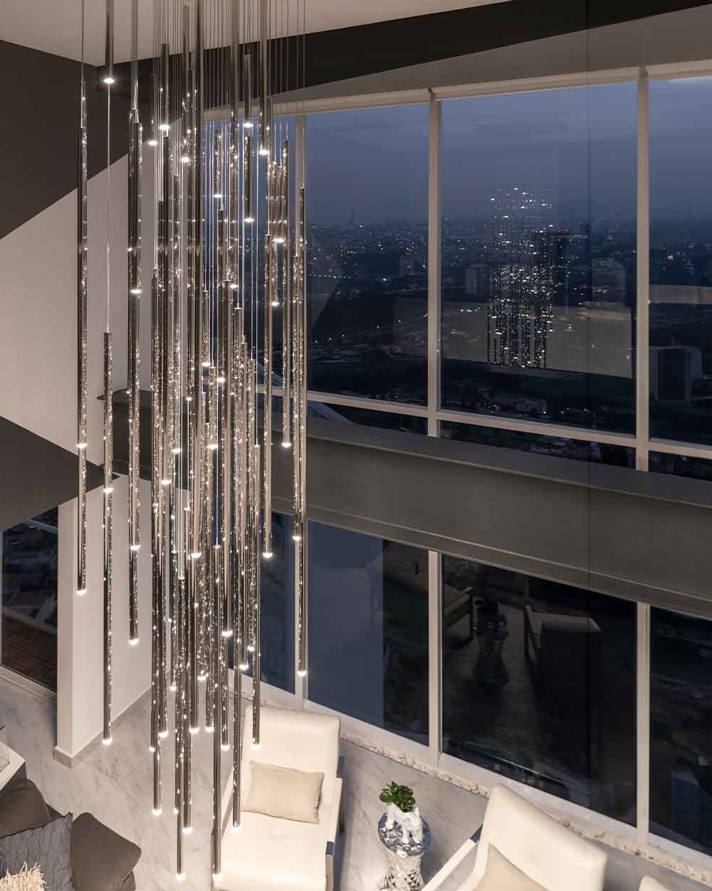 Lungo 60 es majestuosa e imponente. Una lluvia de bastones de acero inoxidable de diferentes medidas, viste ambientes de grandes alturas.