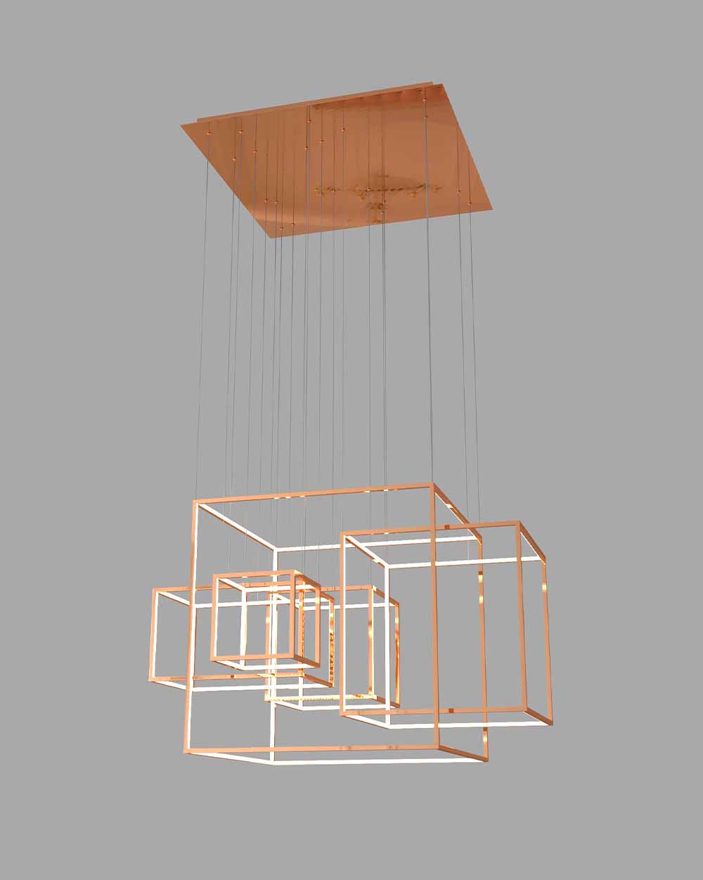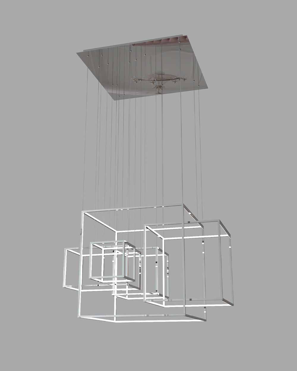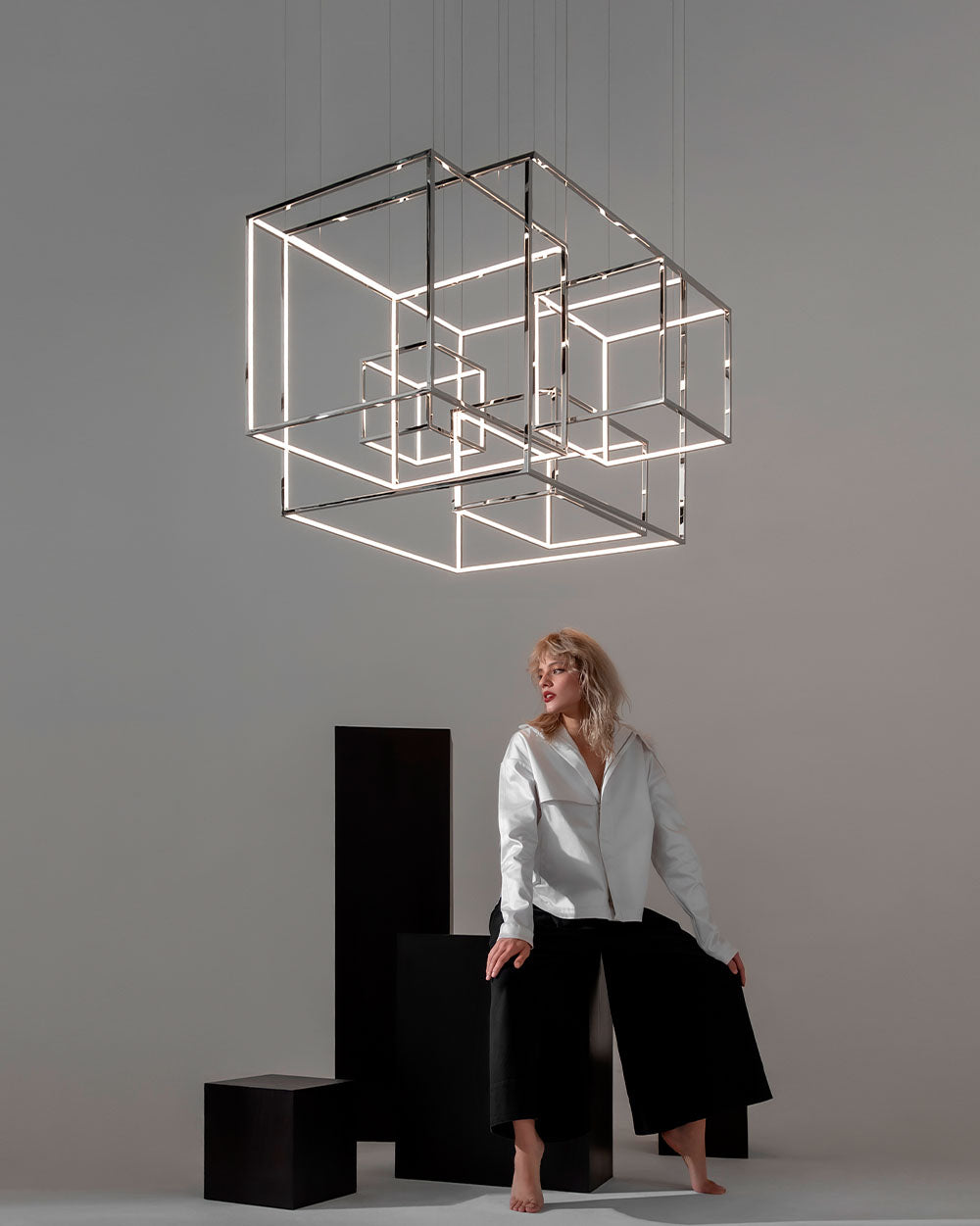 Miles 5, diseño monumental de cubos de acero inoxidable interconectados, su base crea un efecto visual fascinante que multiplica la luz.
